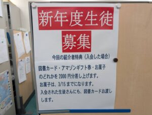 今回も紹介者特典をご用意しています。図書カードやAmazonギフト券、お菓子などをゲットできるチャンス!もちろん、入会された生徒の方にも特典をご用意しております。